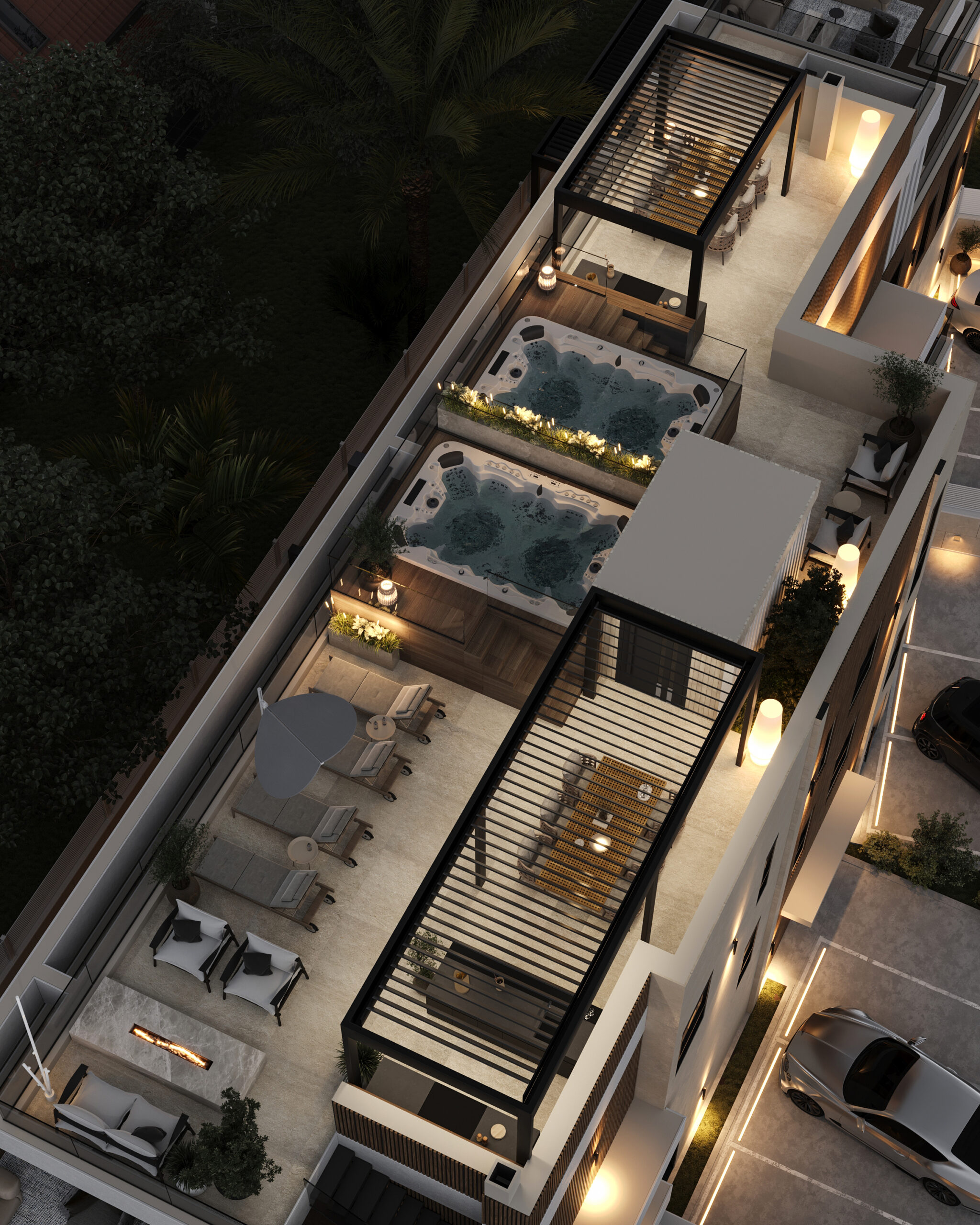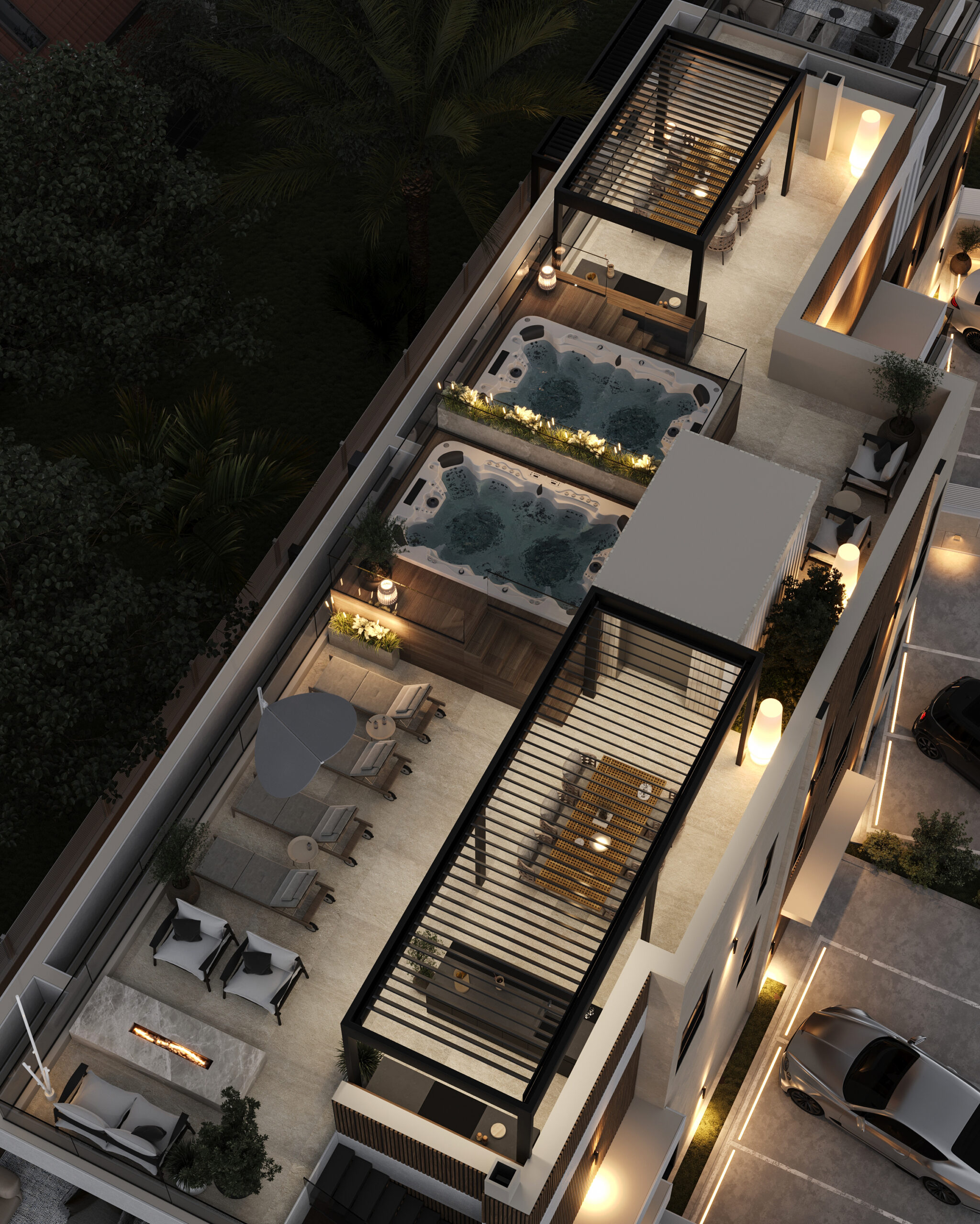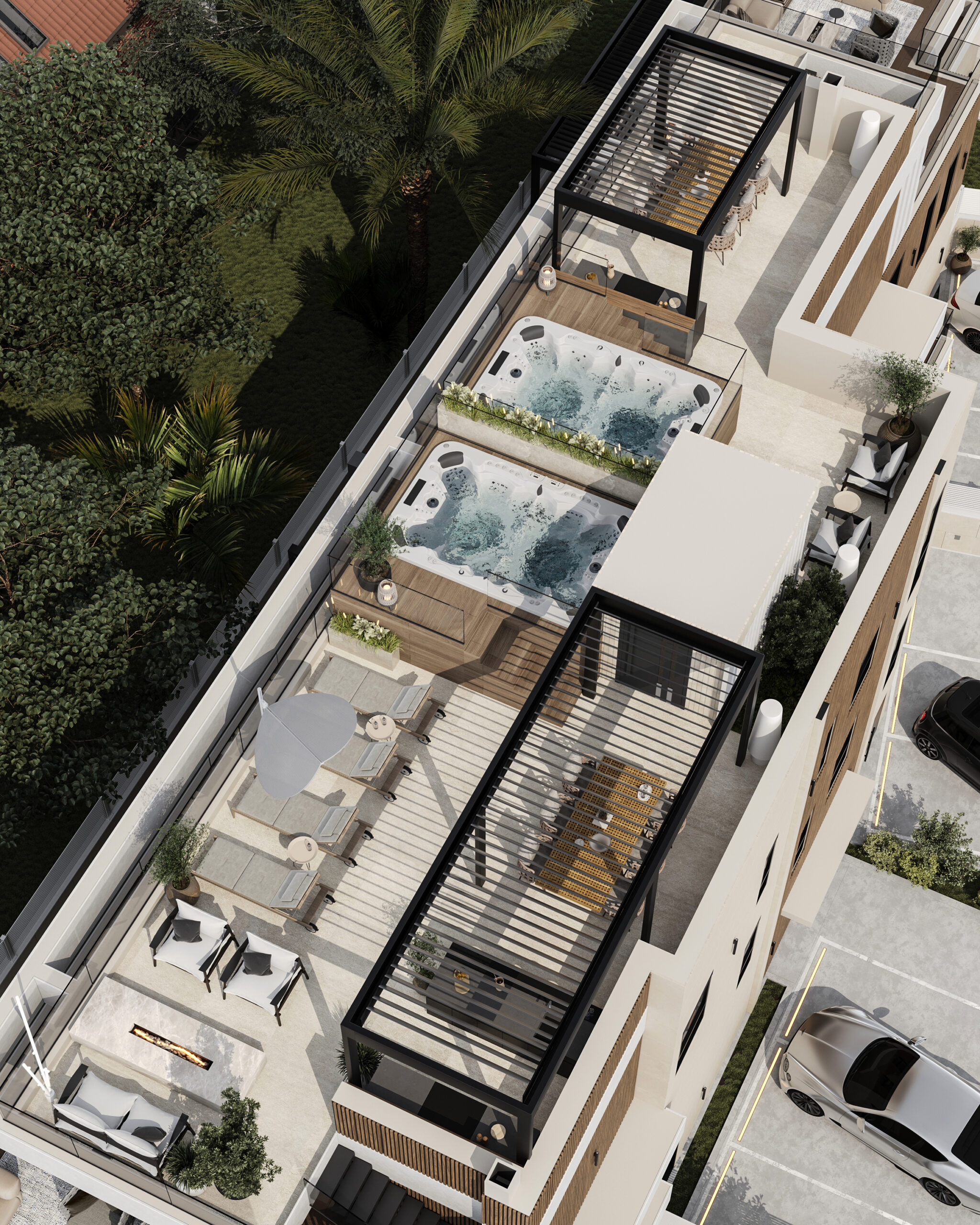Each building will have access to an underground floor with garages and storage rooms for tenants. On the ground floor, there are business premises and apartments with private gardens and swimming pools or jacuzzis. The residential units on the first floor have spacious terraces and access to the pool, while the tenants of the penthouses with their roof terraces can enjoy private heated infinity pools.