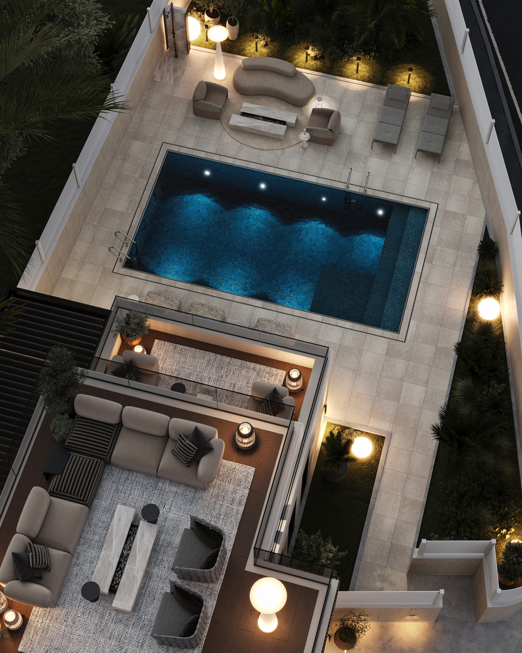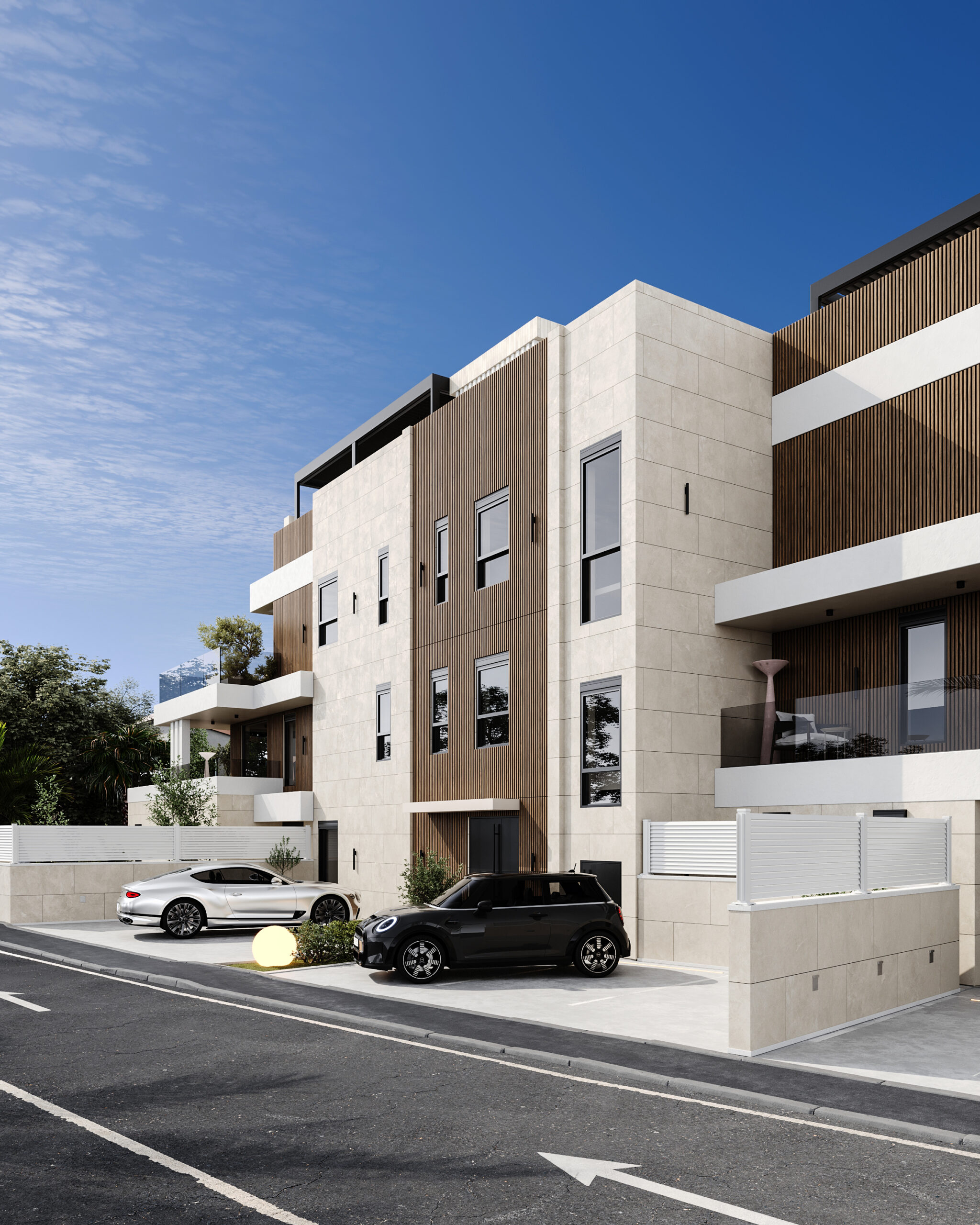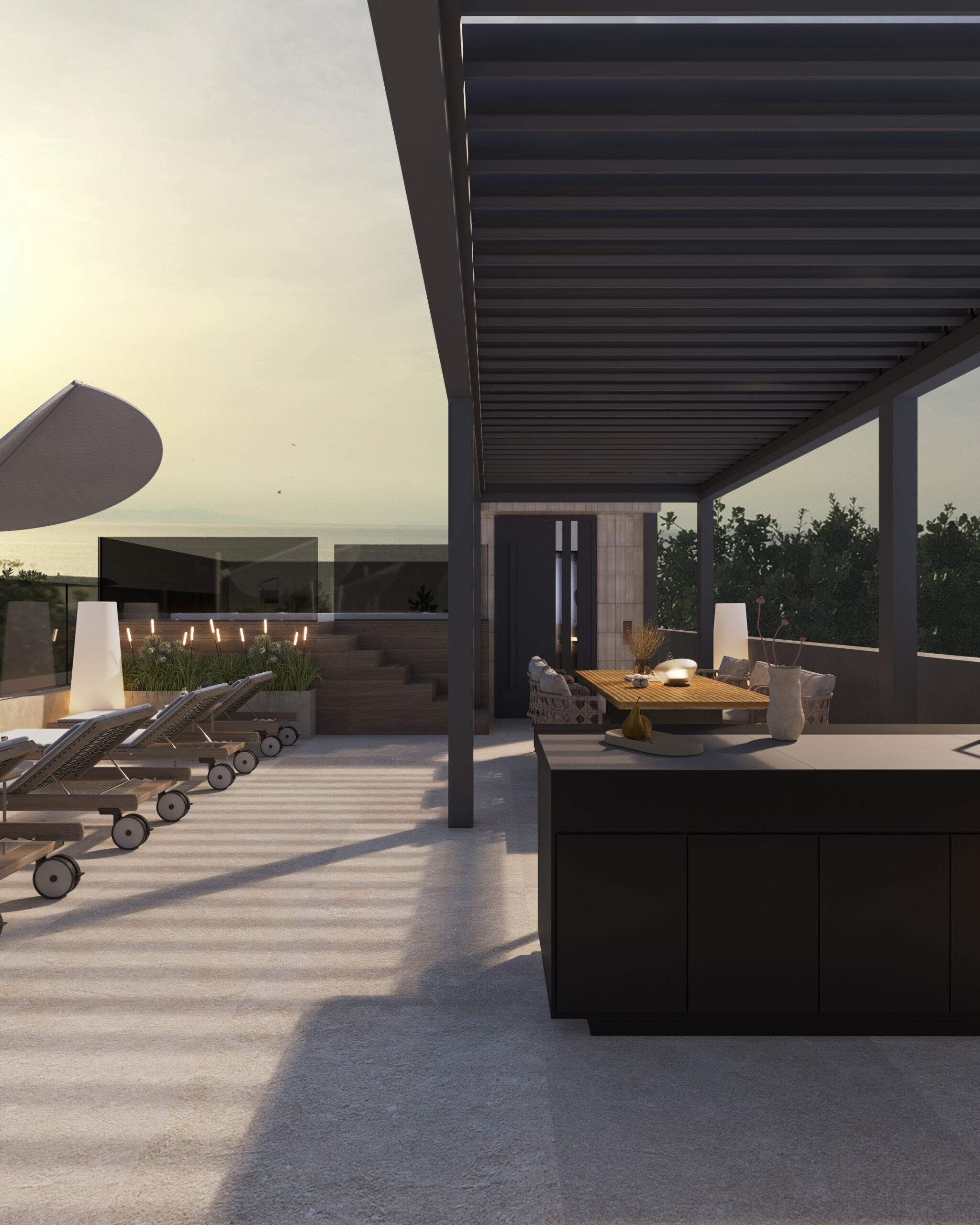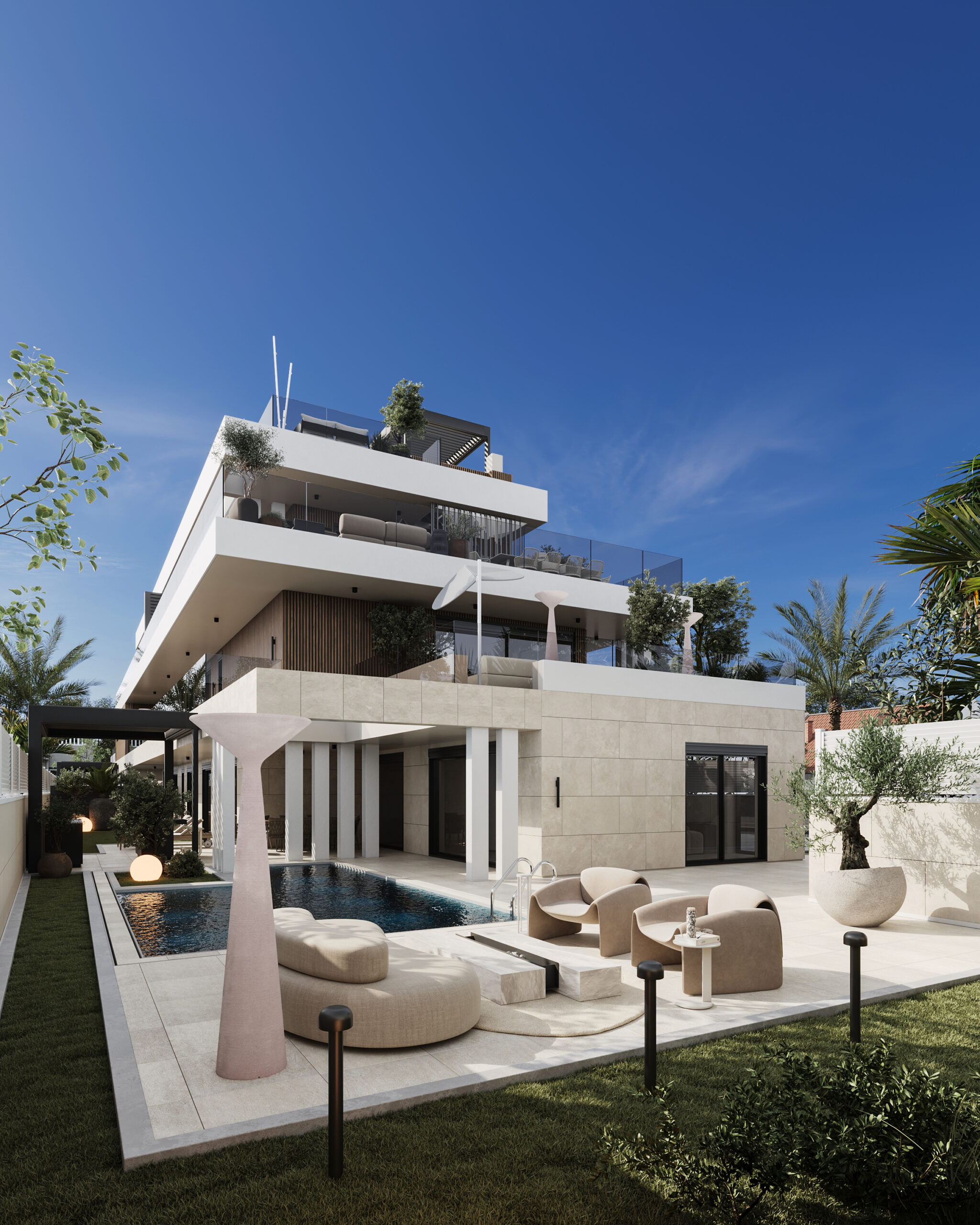 Each building will have access to an underground floor with garages and storage rooms for tenants. On the ground floor, there are business premises and apartments with private gardens and swimming pools or jacuzzis. The residential units on the first floor have spacious terraces and access to the pool, while the tenants of the penthouses with their roof terraces can enjoy private heated infinity pools.