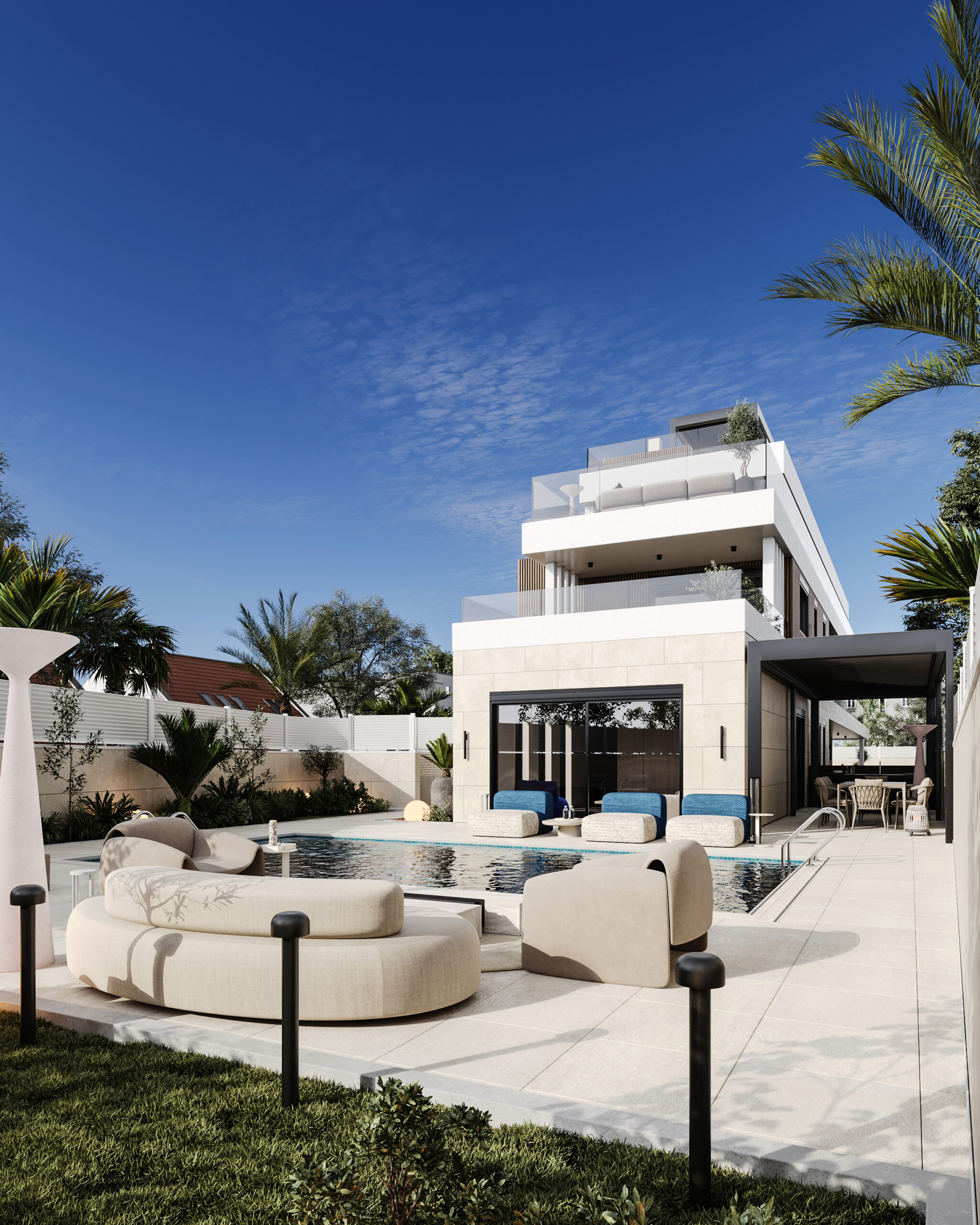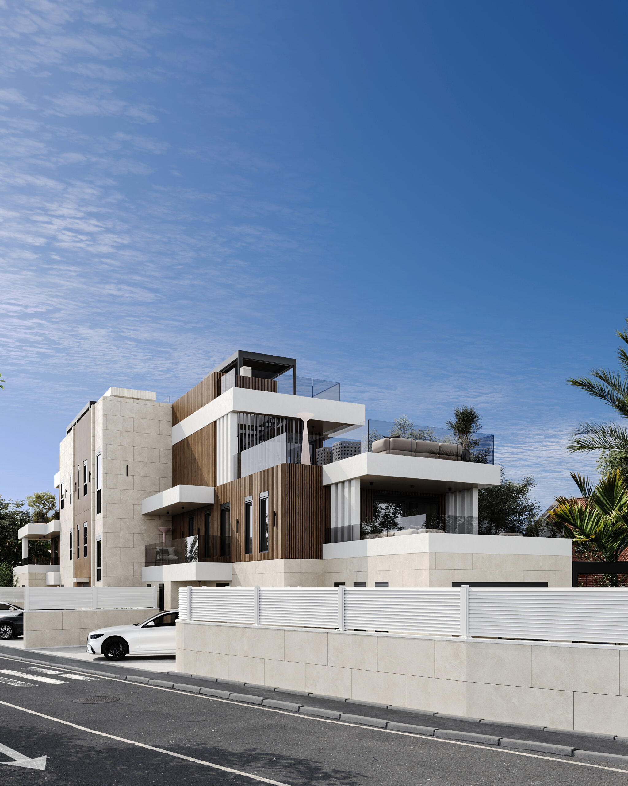 The project consists of nine futuristic buildings with underground garages, private gardens and roof terraces with swimming pools. In the center, there will be central courtyard that will lead, through the ground floor, to each of the buildings. The complex will contain business premises located on the ground floor. The stairs will lead to a plateau level with the first floor, where there will be a common infinity pool with a view of the sea.